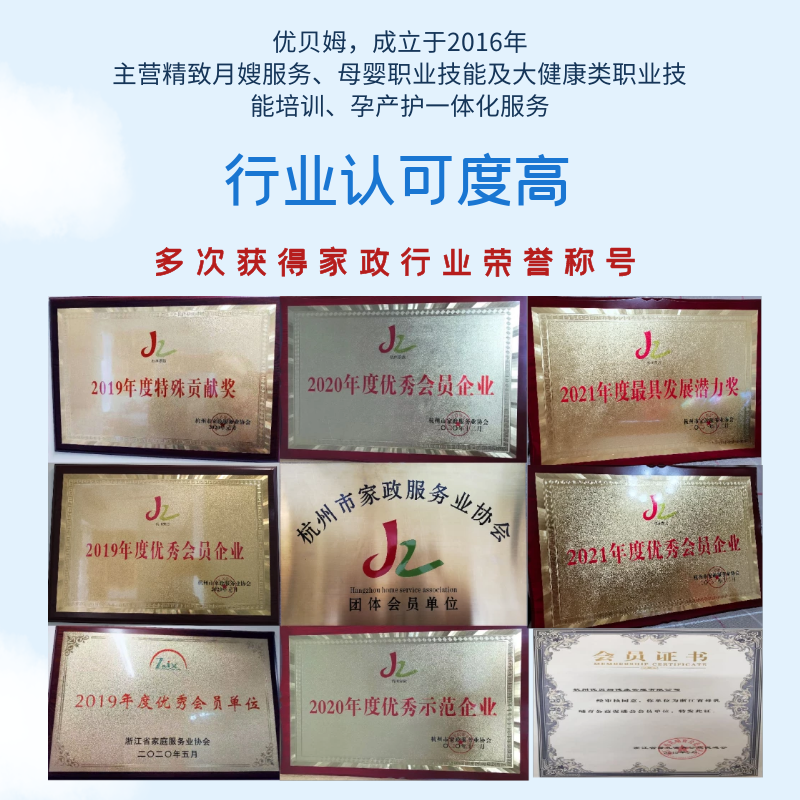 杭州優貝姆健康管理有限公司,成立于2016年,是一家致力于打造集定制居家月嫂服務、孕產護一體化服務、母嬰健康管理培訓學校為一體的現代化母嬰健康管理企業。 連續多年被浙江省家政協會及杭州市家政協會評為:“優秀會員單位”“家政示范企業”“特殊貢獻獎”等殊榮。 多次在浙江省家政技能比賽中獲得優異成績,并代表浙江省參加“長三角家政技能大賽”并取得優異成績。